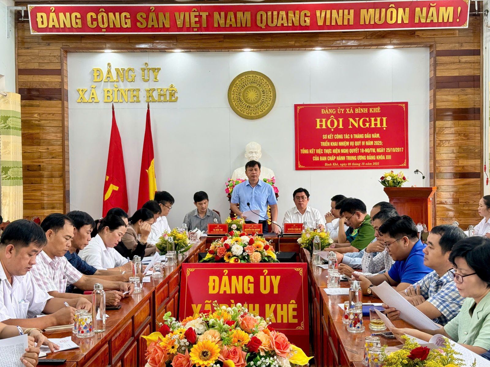 Sáng 09/10/2025, Đảng ủy xã Bình Khê tổ chức Hội nghị sơ kết công tác 9 tháng đầu năm, triển khai nhiệm vụ trọng tâm quý IV năm 2025 và tổng kết thực hiện Nghị quyết số 18-NQ/TW ngày 25/10/2017 của Ban Chấp hành Trung ương Đảng khóa XII về “Một số vấn đề tiếp tục đổi mới, sắp xếp tổ chức bộ máy của hệ thống chính trị tinh gọn, hoạt động hiệu lực, hiệu quả”.