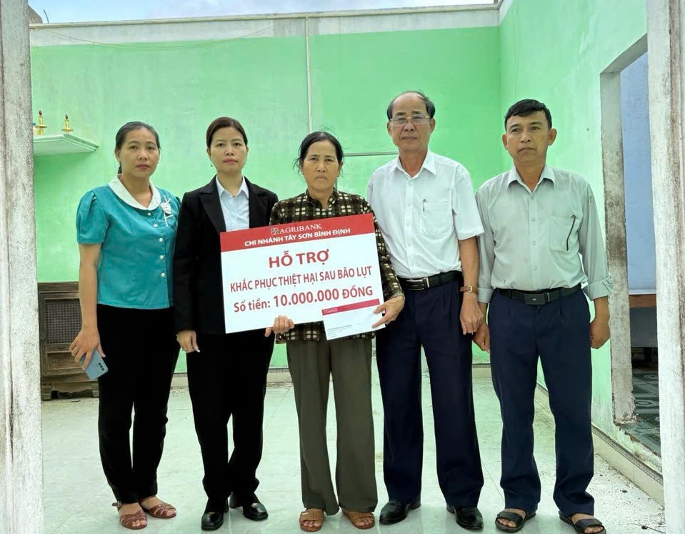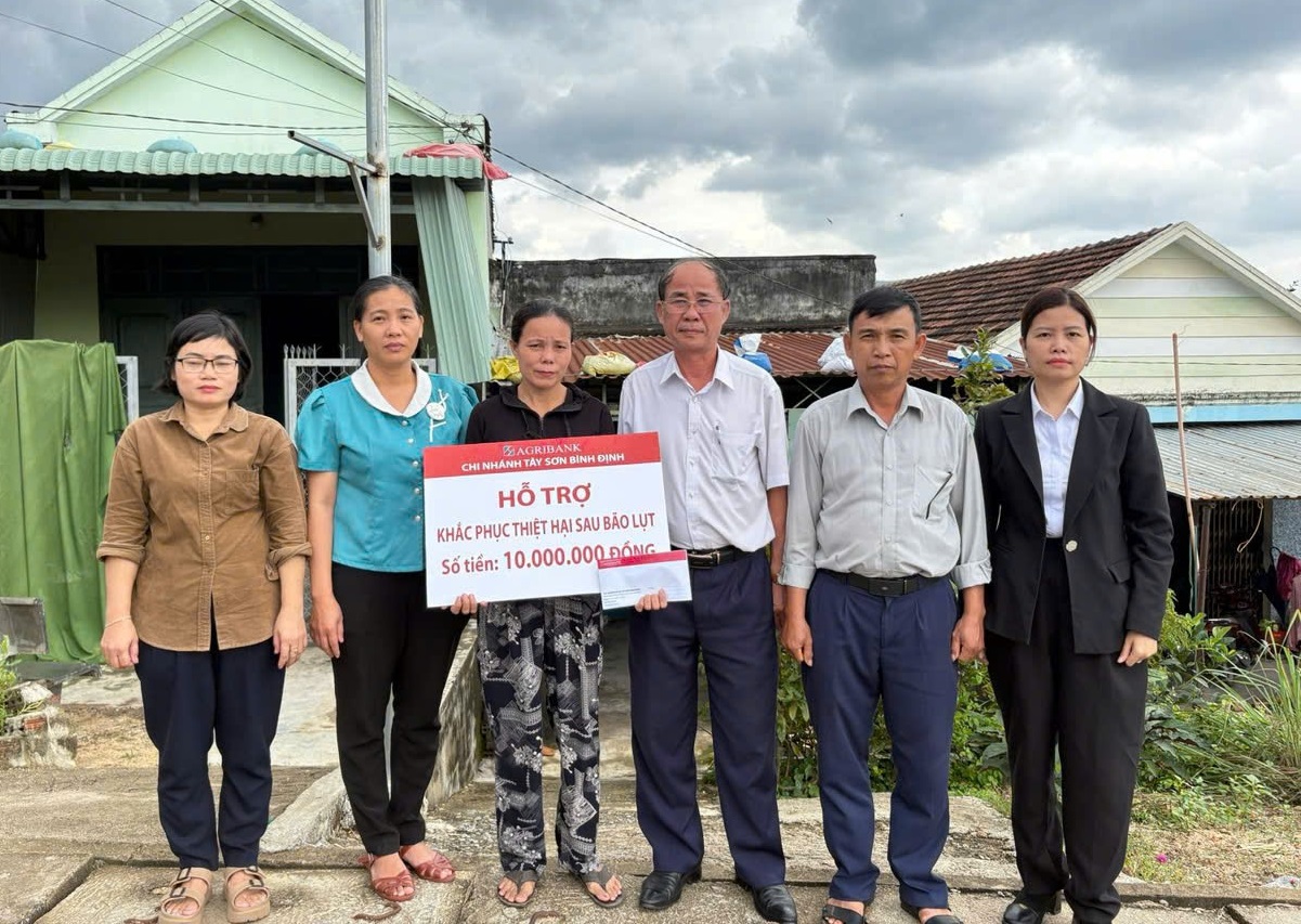 Chia sẻ khó khăn với 2 hộ bị ảnh hưởng nặng do bão số 13 (Kalmaegi), Ngân hàng Agribank - chi nhánh Tây Sơnvà lãnh đạo UBND xã đã ân cần thăm hỏi, động viên 2 hộ dân cố gắng vượt qua khó khăn, sớm ổn định cuộc sống. Đồng thời, trao tặng hộ ông Lâm Ngọc Quan ở thôn Hòa Thuận với số tiền 10 triệu đồng và hộ bà Phan Thị Mỹ Gái ở thôn Thượng Giang 2 với số tiền 10 triệu đồng.