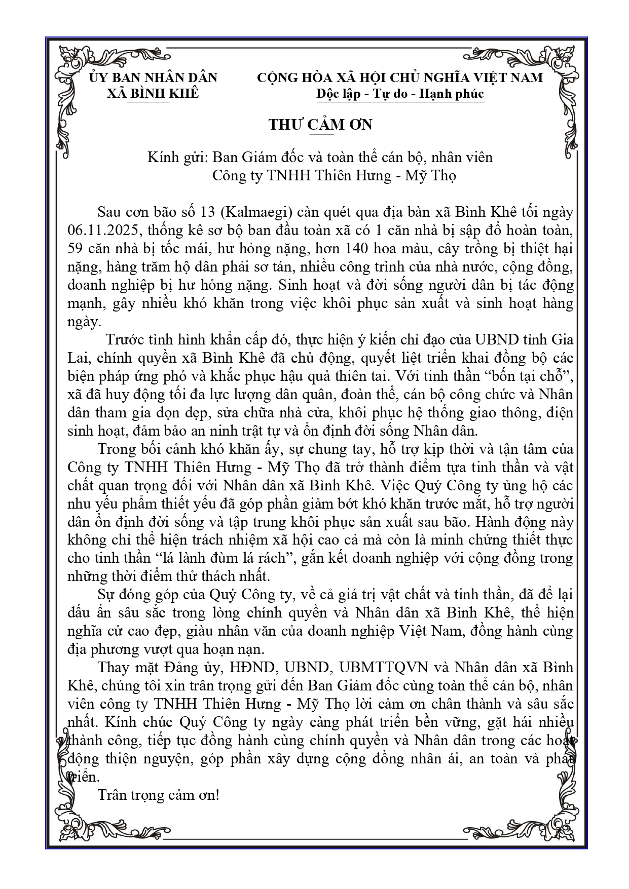 Thay mặt Đảng ủy, HĐND, UBND, UBMTTQVN và Nhân dân xã Bình Khê, chúng tôi xin trân trọng gửi đến Ban Giám đốc cùng toàn thể cán bộ, nhân viên công ty TNHH Thiên Hưng - Mỹ Thọ lời cảm ơn chân thành và sâu sắc nhất. Kính chúc Quý Công ty ngày càng phát triển bền vững, gặt hái nhiều thành công, tiếp tục đồng hành cùng chính quyền và Nhân dân trong các hoạt động thiện nguyện, góp phần xây dựng cộng đồng nhân ái, an toàn và phát triển.